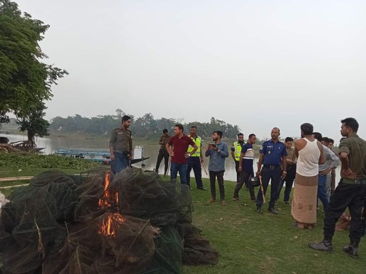 মধ্যনগরে জেলের কারাদণ্ড,জালগুলো আগুনে পুড়িয়ে ধ্বংস